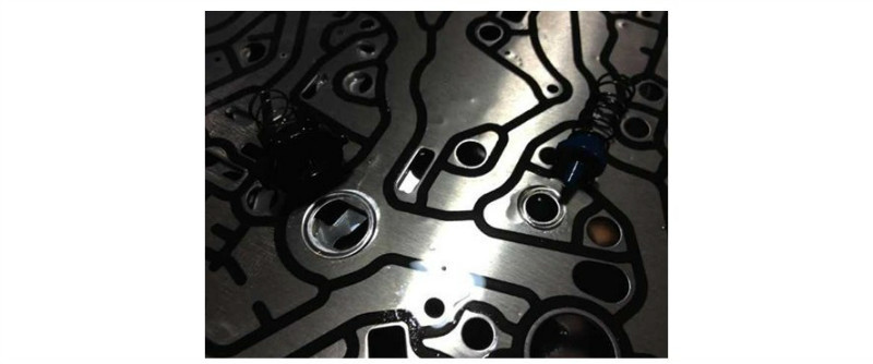 因为反复试车都不见好转因此大家怀疑是不是液压控制阀体出现了问题(根据使用时间和车辆使用里程来判断该元件不能过早的出现问题,但对于一个新产品来讲也不排除存在一些小问题。),于是死马当活马医决定把阀体解体检查。当分解阀体时大家才发现跟原来的6HP系列一样阀体中间隔板垫是带密封胶的那种(一次性的),但不过也确确实实看到点问题那就是在阀体中间隔板上有被单向阀冲击出很严重的痕迹(见图2),这充分说明因该是系统压力不稳定而导致阀孔冲出严重痕迹(在过去只有行驶具有相当一定里程后的车辆才可能出现这种现象)。